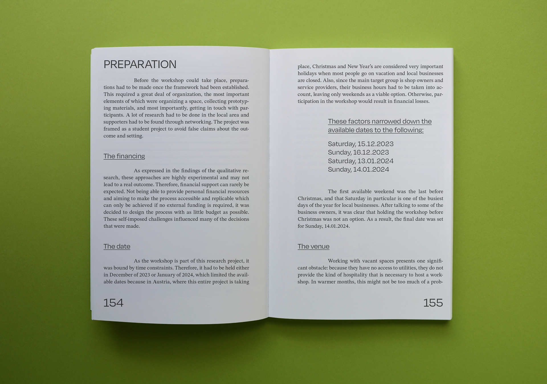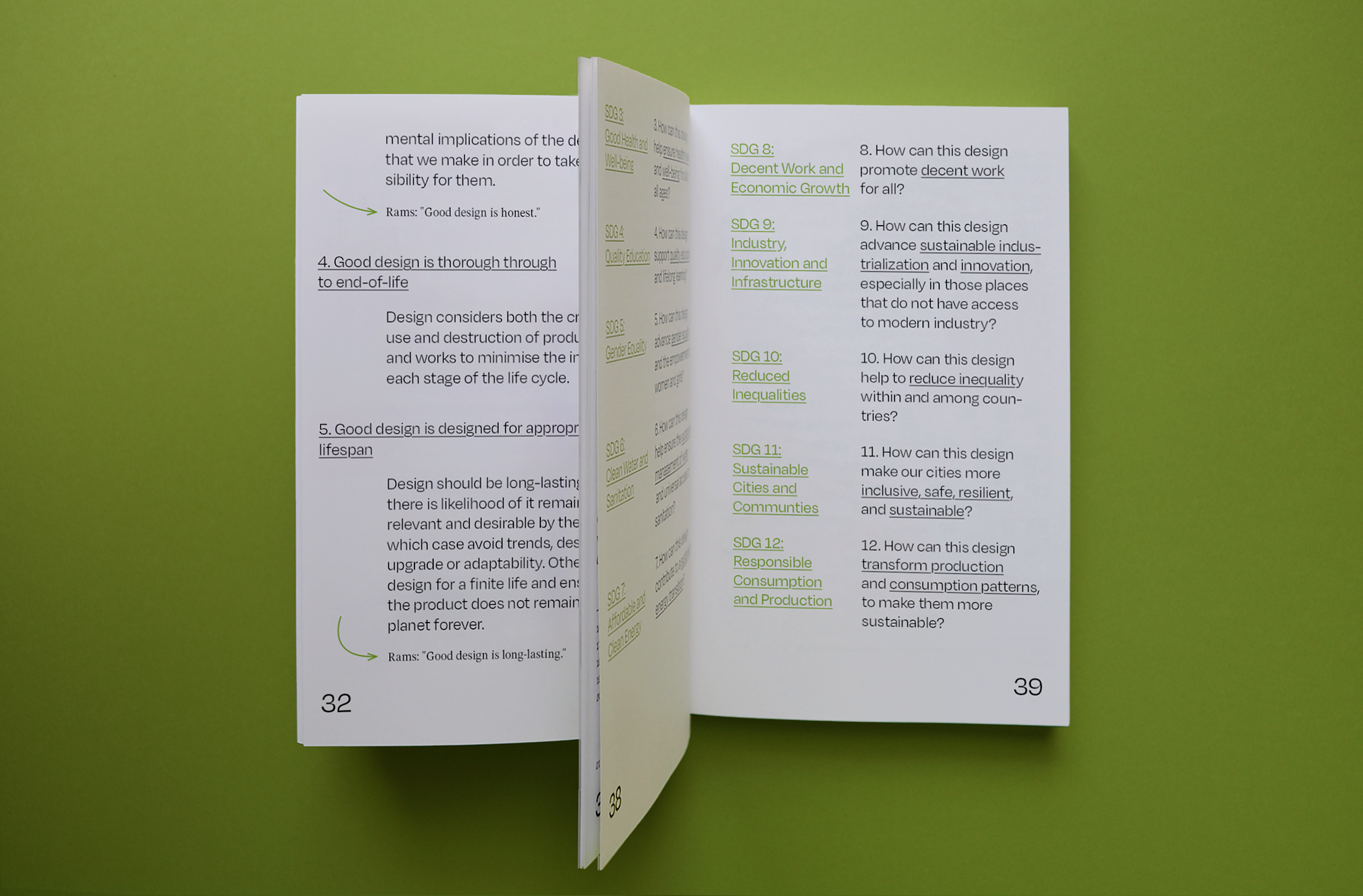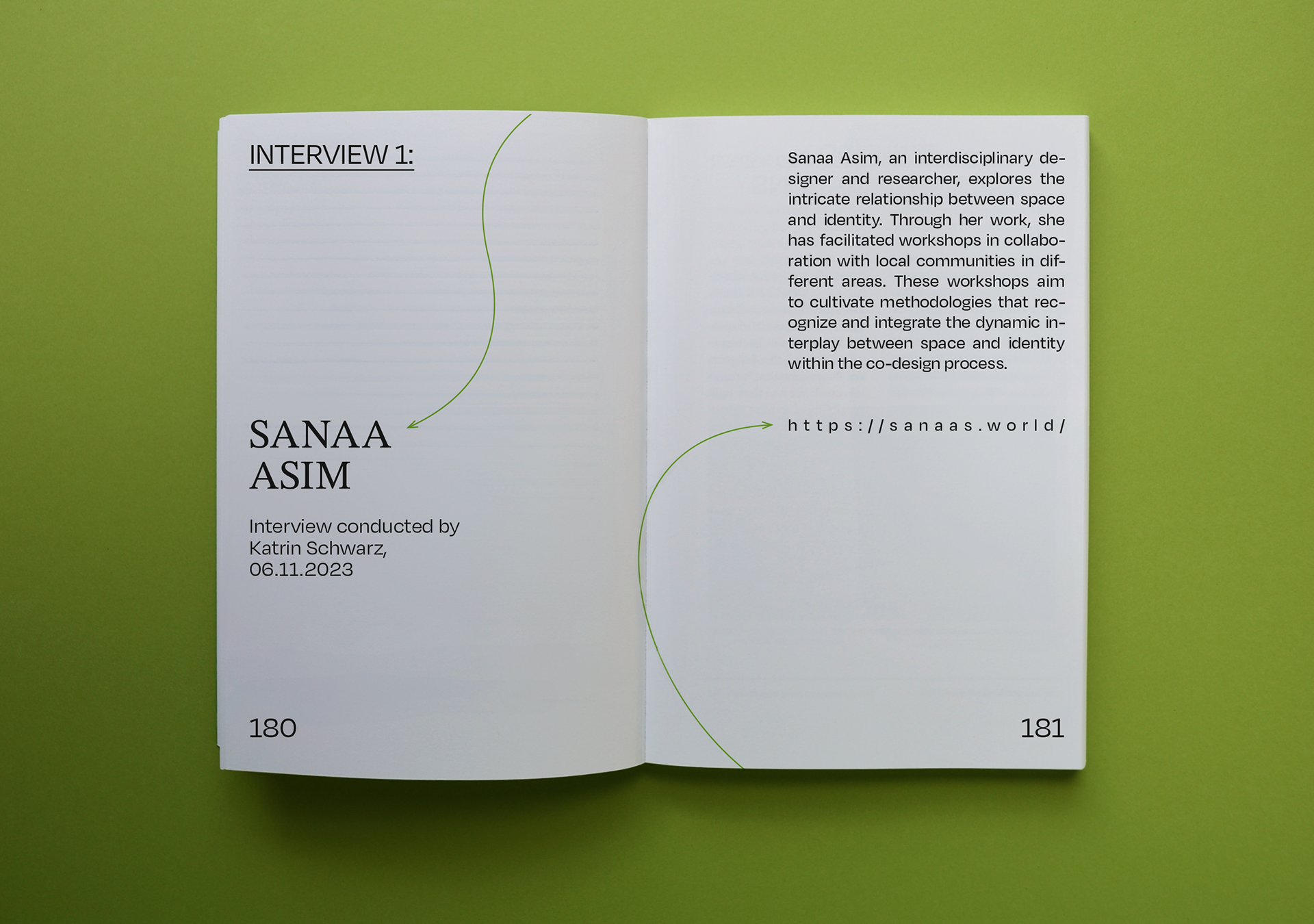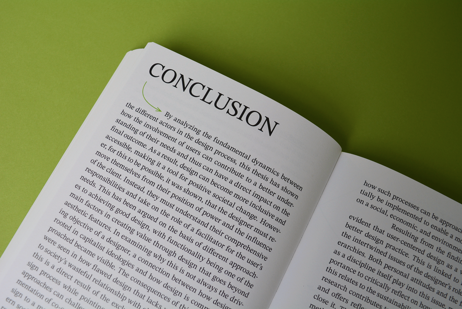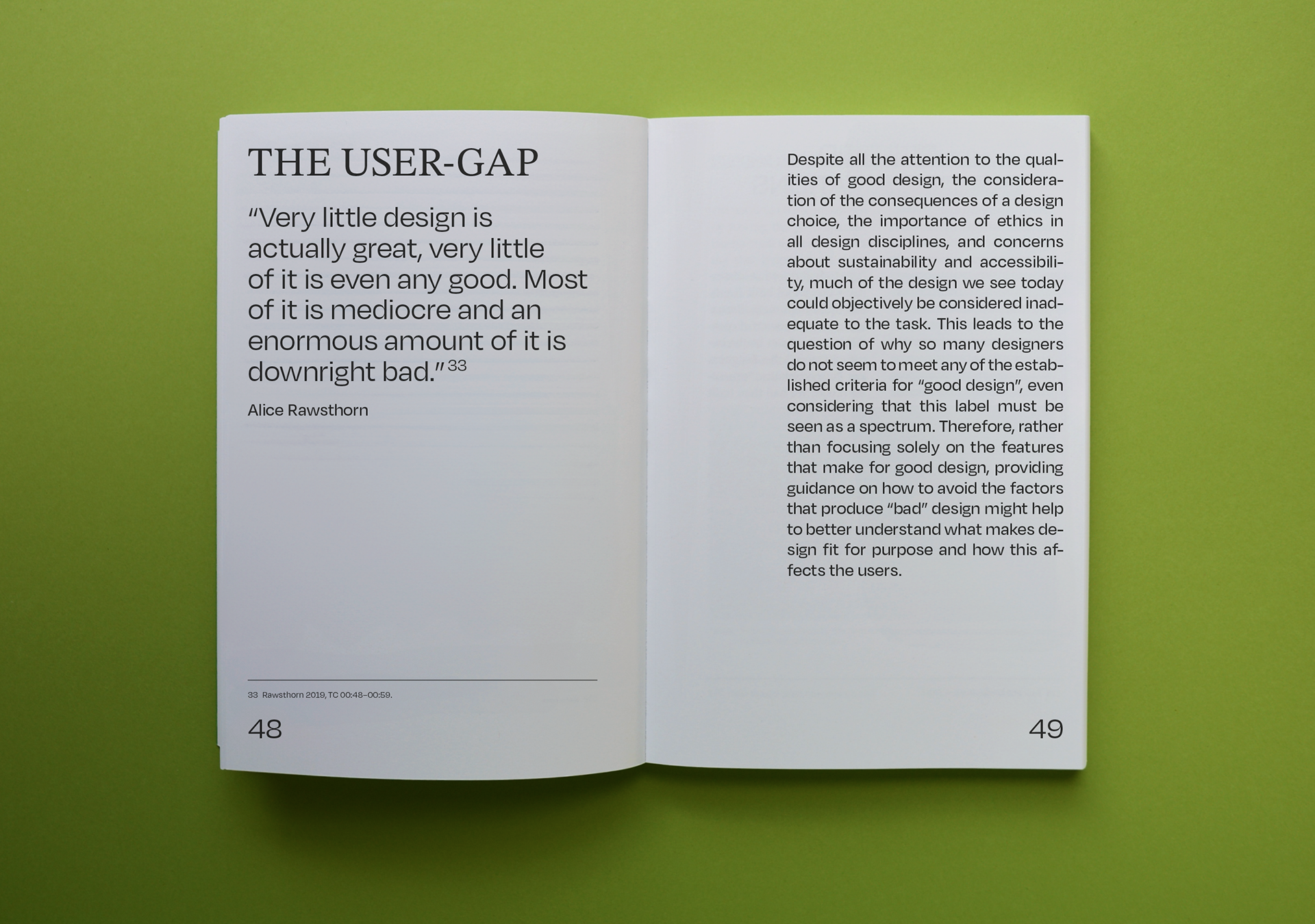 The editorial design reflects some of the main themes presented in the research. Therefore a minimalist design system using typography was applied which easily guides the reader through different layers of information. In addition to this system, the only graphic element being used is a green arrow which either highlights or makes connections between different ideas. Furthermore, this creates tension in the layout when needed.